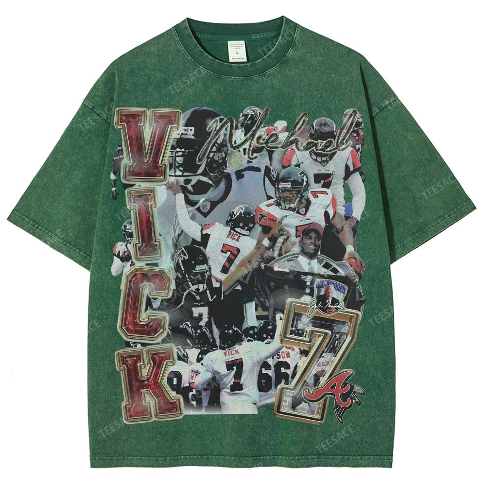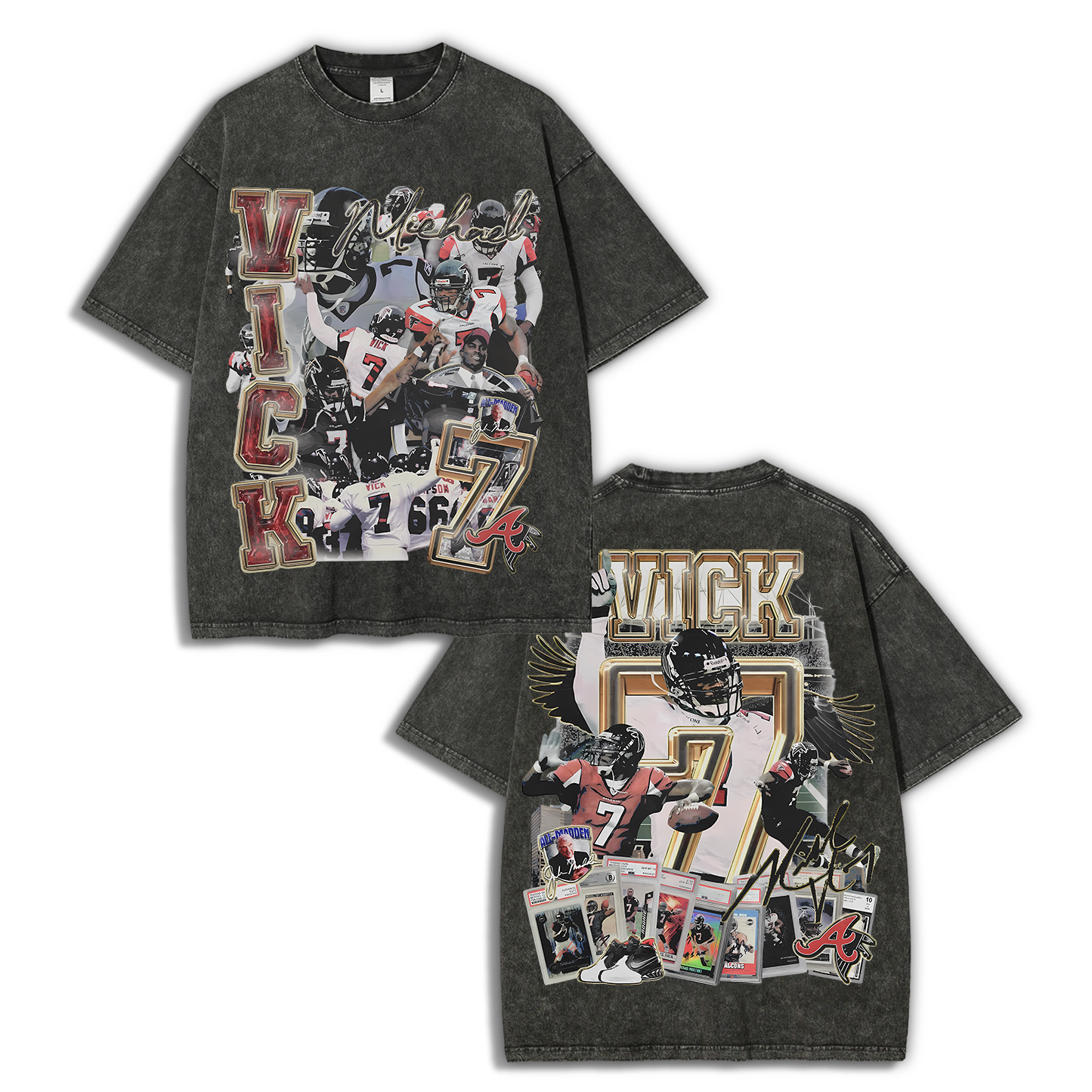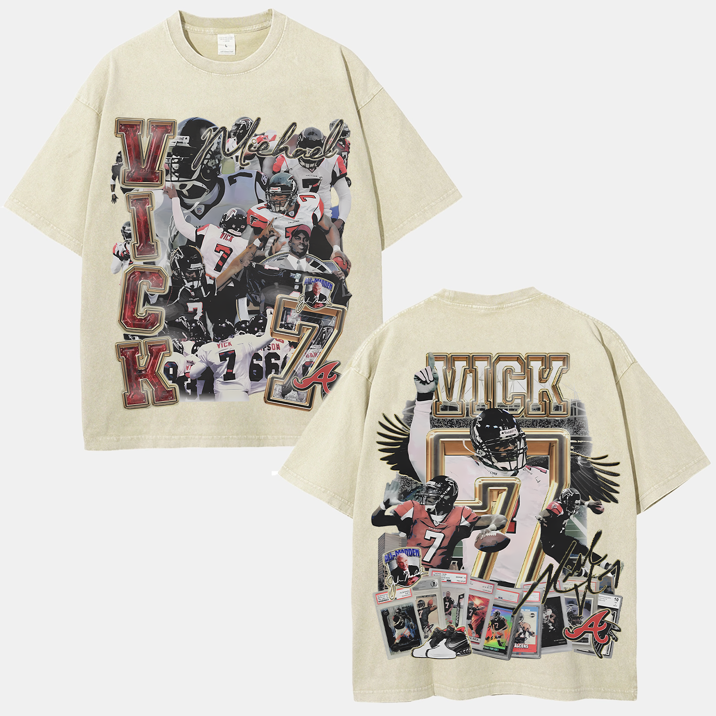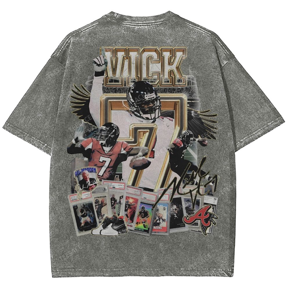 White t-shirt withoversized Mike Vick front and back print featuring front & backgraphics inspired by the Atlanta Falcons icon. Perfected cut for that iconic slightly oversized. boxy fit with a dropper shoulder. It's recommended to stay true to size for an intended slightly oversized fit.