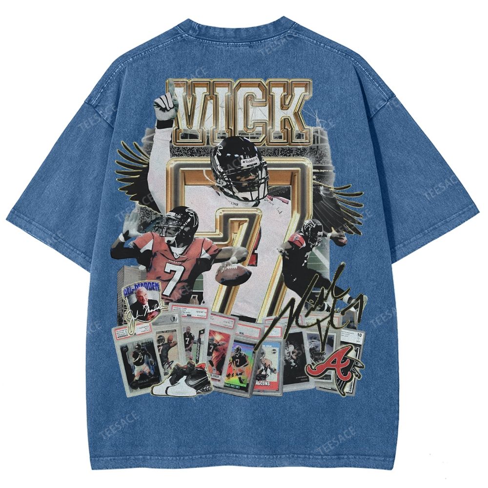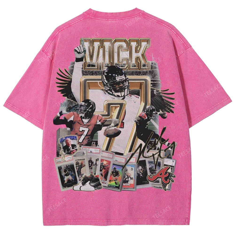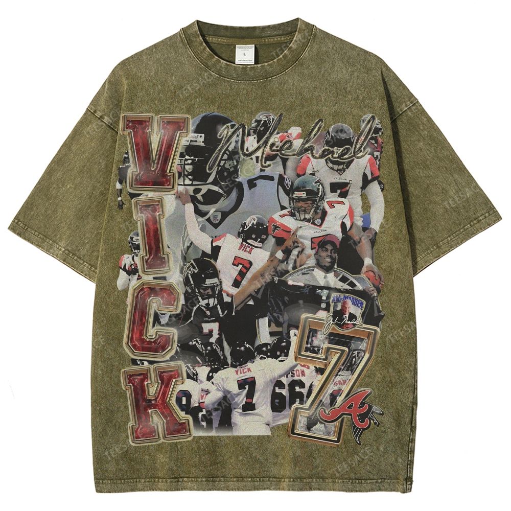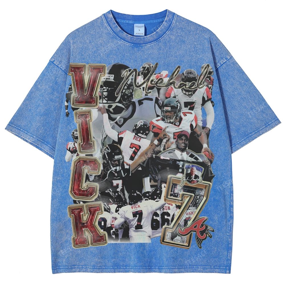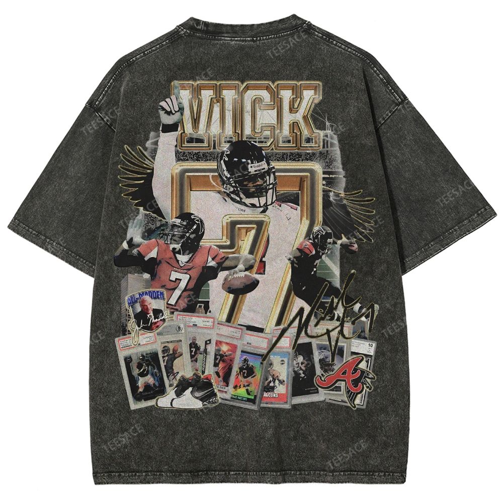 White t-shirt withoversized Mike Vick front and back print featuring front & backgraphics inspired by the Atlanta Falcons icon. Perfected cut for that iconic slightly oversized. boxy fit with a dropper shoulder. It's recommended to stay true to size for an intended slightly oversized fit.
